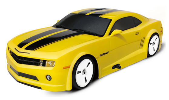 Полноприводная радиоуправляемая автомодель для дрифта Team Magic E4D Brushless с кузовом Chevrolet Camaro в желтом цвете.