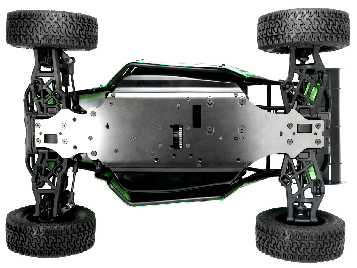 Шасси модели сделано из сверхпрочного и ультралёгкого 4-мм алюминия. Трансмиссия содержит три дифференциала с высокоточными шестернями изготовленными на профессиональном CNC-оборудовании для надёжного обеспечения передачи крутящего момента к каждому из четырёх колёс! Высокопроизводительные шины изготовлены специально для грунтовых трасс с отличным сцеплением и длительным сроком службы.