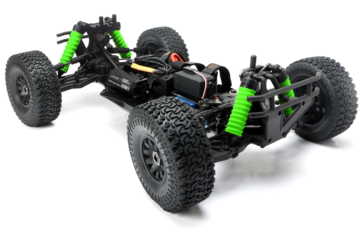 Алюминиевые стойки амортизаторов и стабилизаторы поперечной устойчивости на обеих осях уменьшат виляние шасси. Гибкие упругие бамперы в комплексе с производительным спойлером помогают погасить удары и увеличить прижим к дороге для ещё более качественного сцепления с трассой. Дополнительные чехлы на амортизаторах помогают защитить штоки амортизаторов от повреждений и задиров во время гонки по грунтовой или песчанной местности.