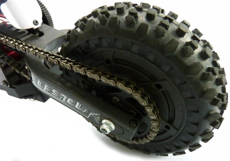 Модель мотоцикла Himoto Burstout MX400 хорошо сбалансирована и укреплена металлическими деталями. Алюминиевая рама, настоящая стальная цепь и закрытый влагозащищённый бокс для электроники обеспечивают надёжность и удароустойчивость. Запатентованная система гироскопов, мощные амортизаторы и сильная рулевая машинка обеспечивают абсолютную устойчивость на любой местности. Сердце мотоцикла - мощный электродвигатель 550-го класса, который питается от Li-pol аккумулятора 7.4В и позволяет разгоняться до 40 км/час.
